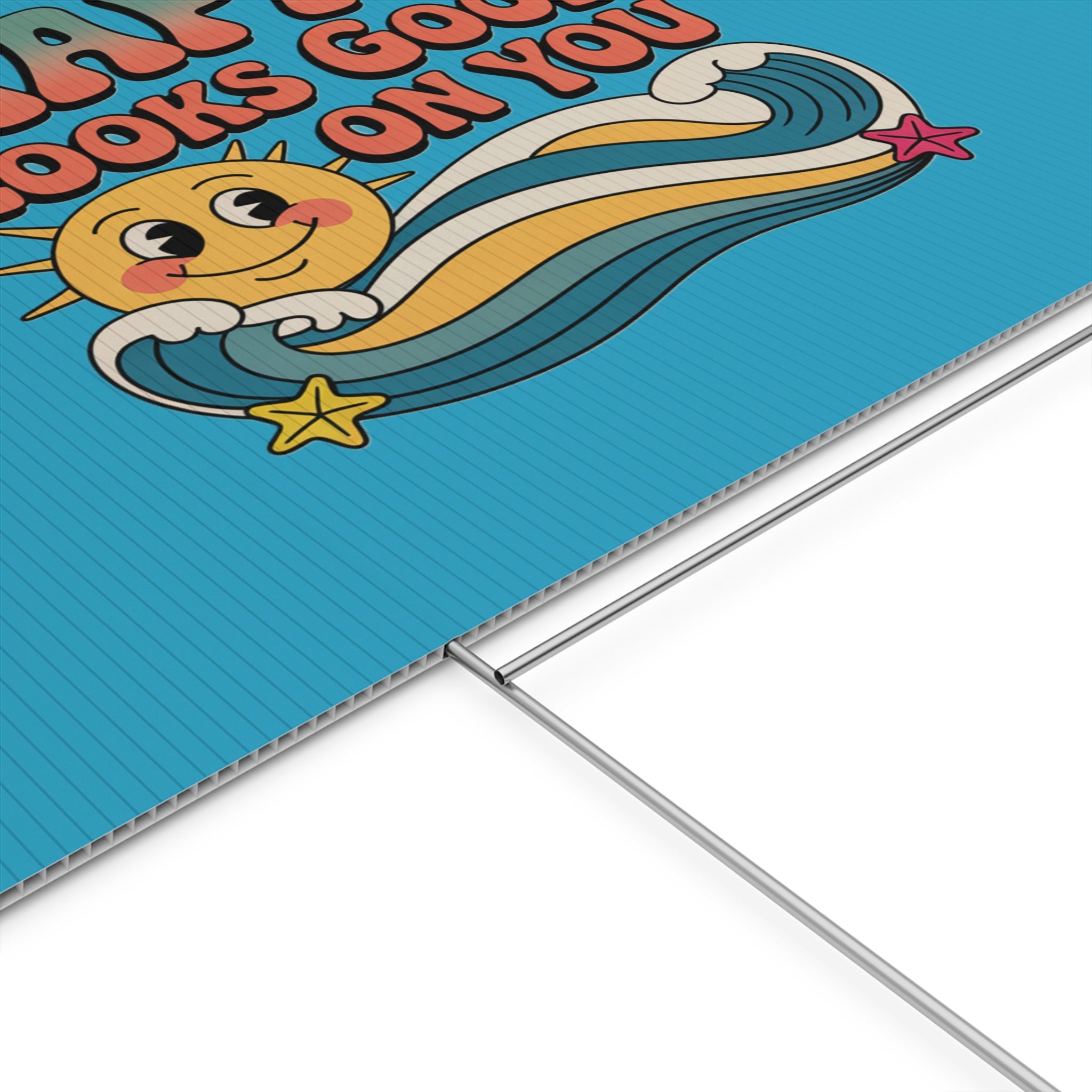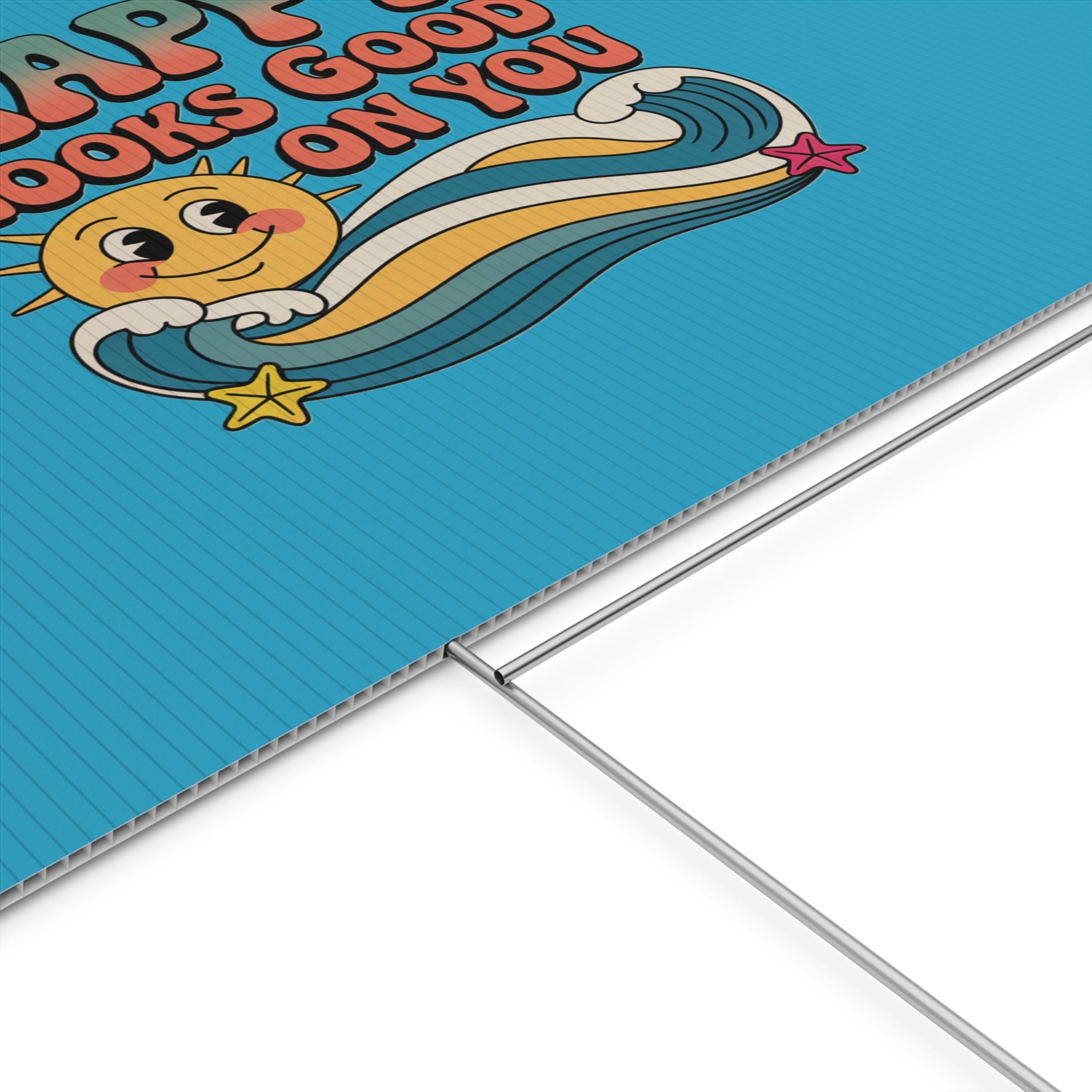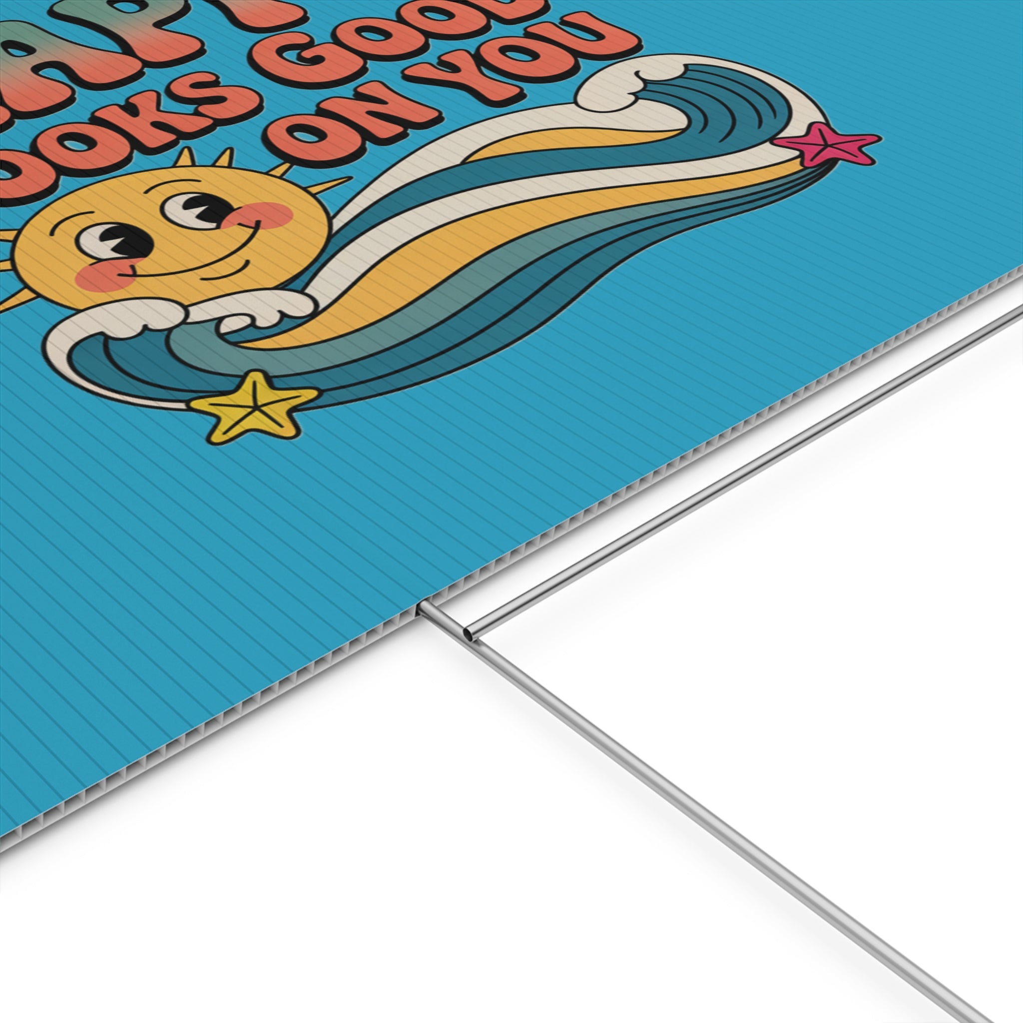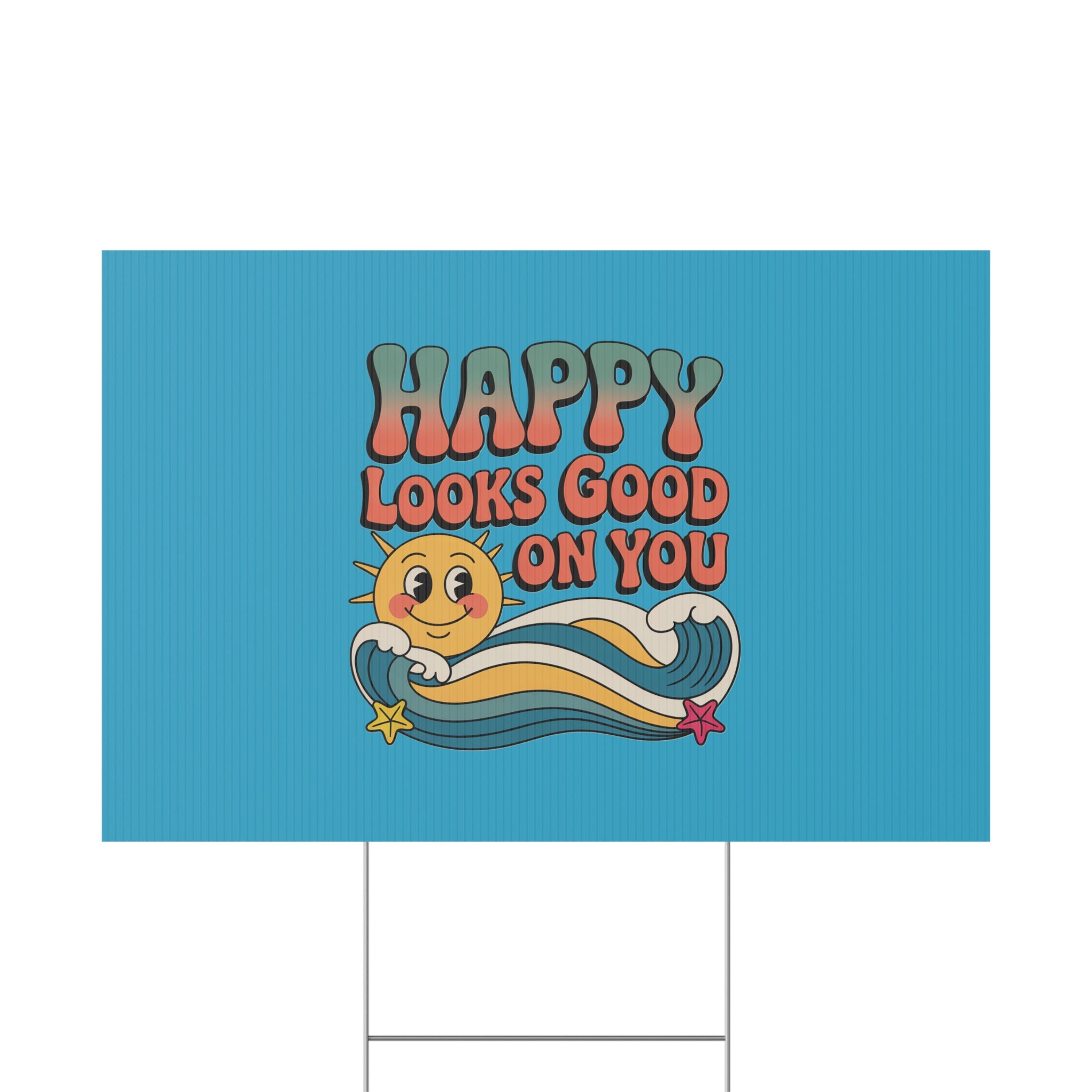 A cheerful outdoor yard sign that brings bright, vintage energy to lawns and garden beds. The corrugated plastic panel features a retro smiling sun and colorful wave motif with the uplifting message “Happy Looks Good On You,” printed on both sides so the design reads from either direction. Weather-ready and lightweight, it slips onto the included aluminum stake for quick placement in soil or grass. Use the portrait or landscape orientation to suit your space — from front lawns and porches to community events and garden paths — and enjoy a sunny, feel-good accent that was made and printed in the USA.