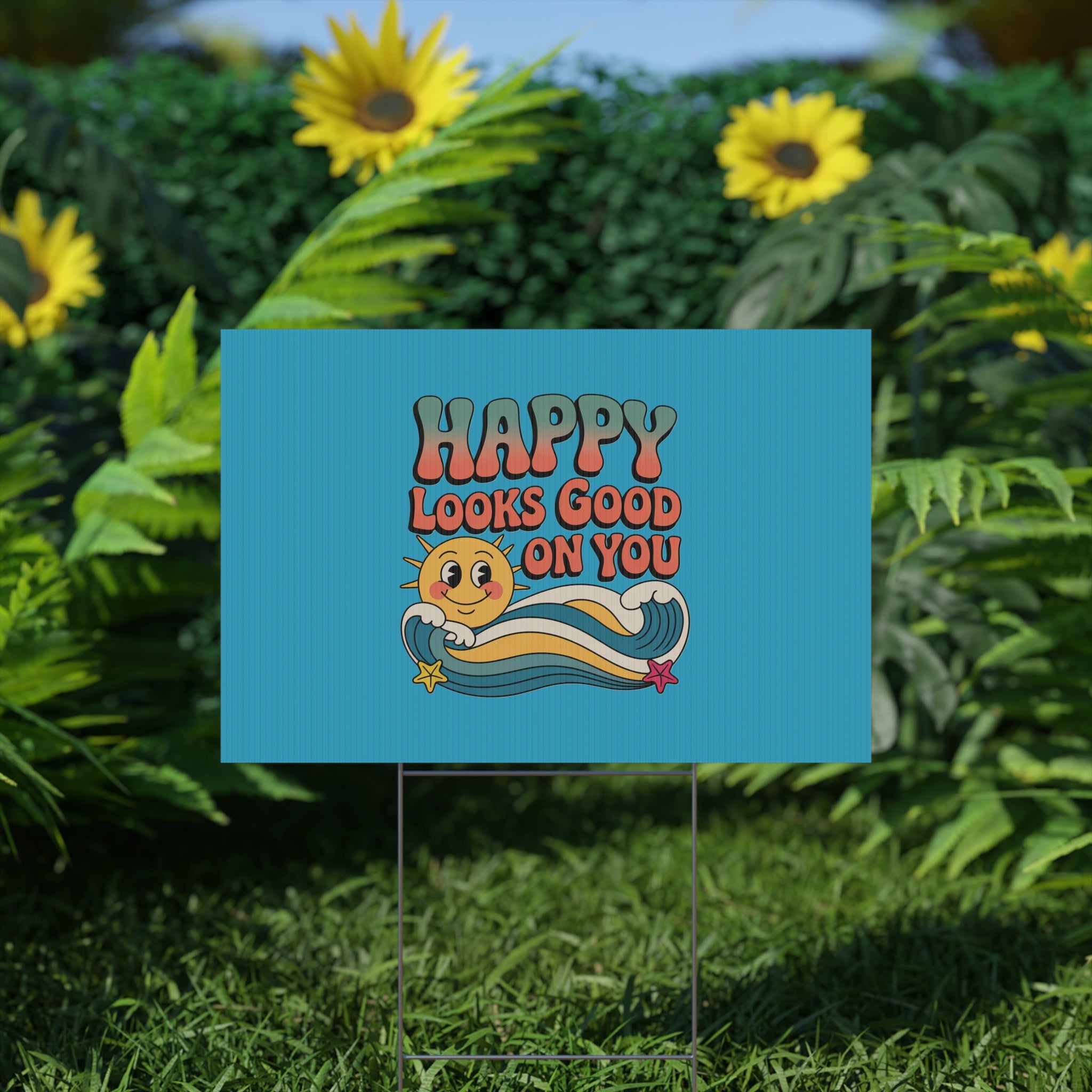 "Happy Looks Good On You" Retro Sun Positive Garden Sign