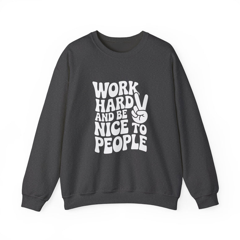 Stay cozy and stylish with this unisex heavy blend crewneck sweatshirt, perfect for anyone who values comfort and a positive message. The uplifting phrase, "WORK HARD AND BE NICE TO PEOPLE," adds an inspiring touch to your casual wardrobe. Whether you're lounging at home, running errands, or meeting friends, this sweatshirt effortlessly fits into your daily life, promoting warmth and good vibes. Ideal for adults seeking a blend of comfort and encouragement, this sweatshirt makes a thoughtful gift for birthdays or just because. With its timeless design, it’s suitable for all seasons and can be worn during holidays, casual outings, and cozy gatherings with loved ones.